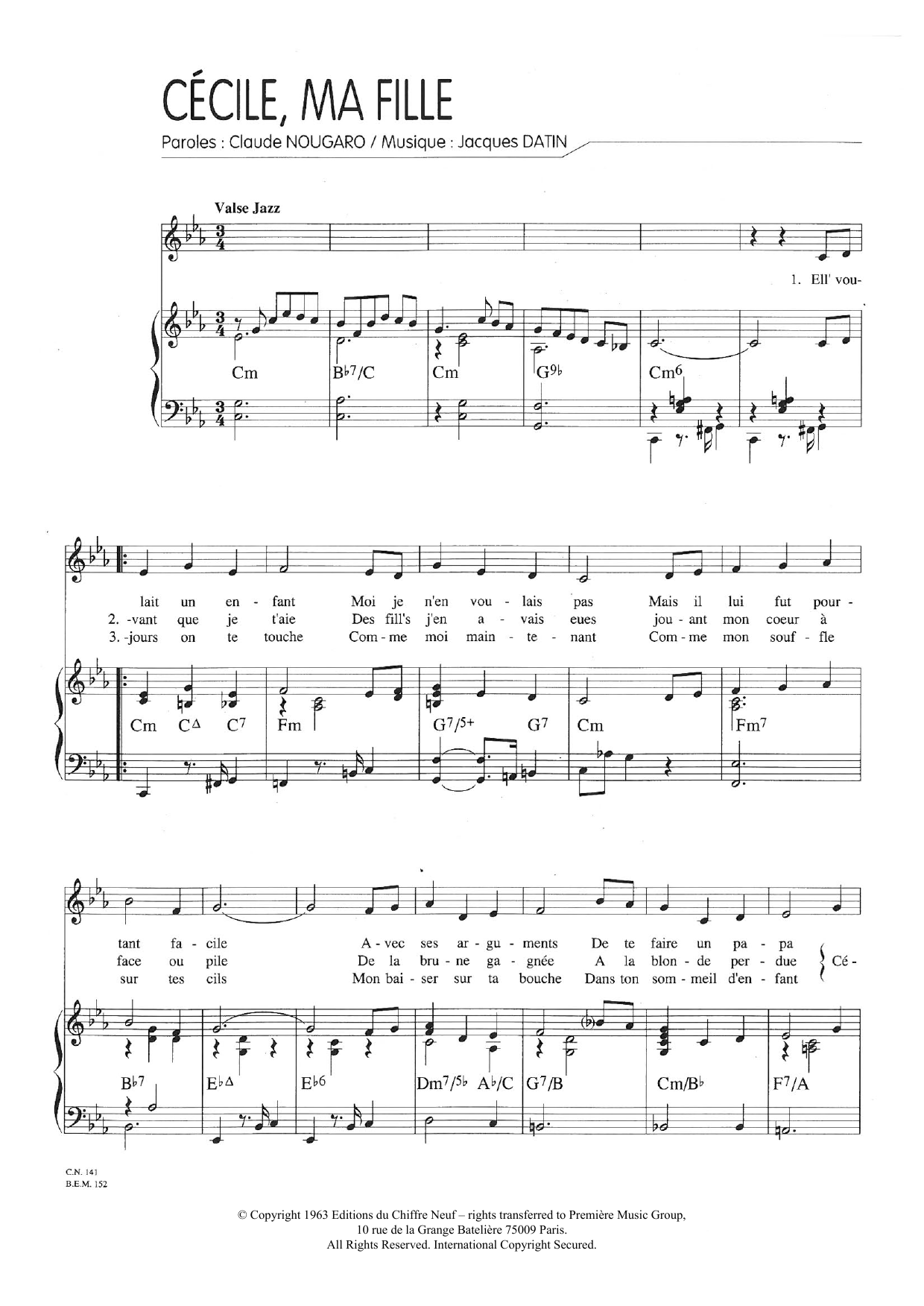 Download or print Claude Nougaro Cecile Ma Fille sheet music, chords and digital score arranged for Piano & Vocal. This Pop score includes 3 page(s).
