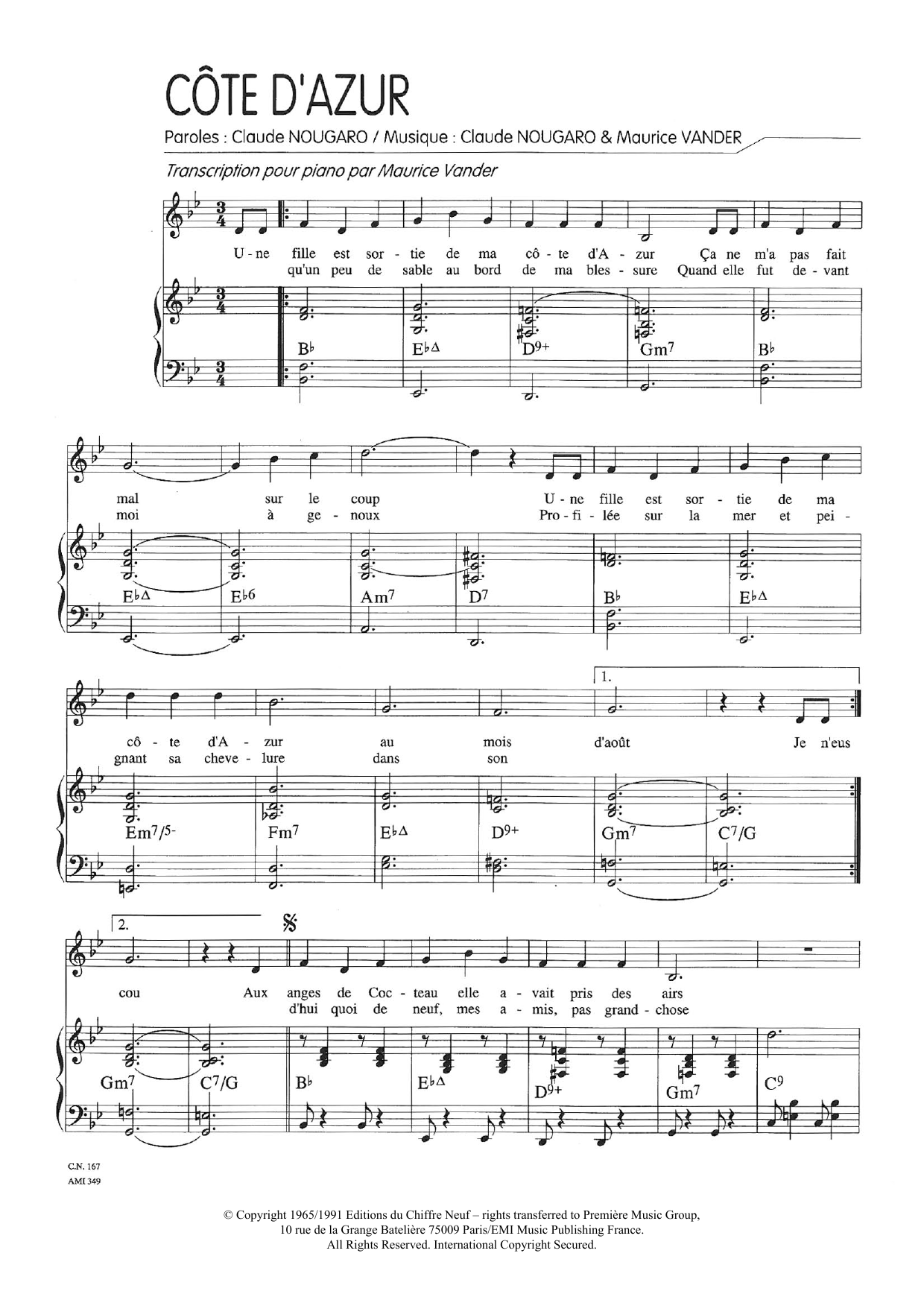Download or print Claude Nougaro Cote D'azur sheet music, chords and digital score arranged for Piano & Vocal. This Pop score includes 4 page(s).