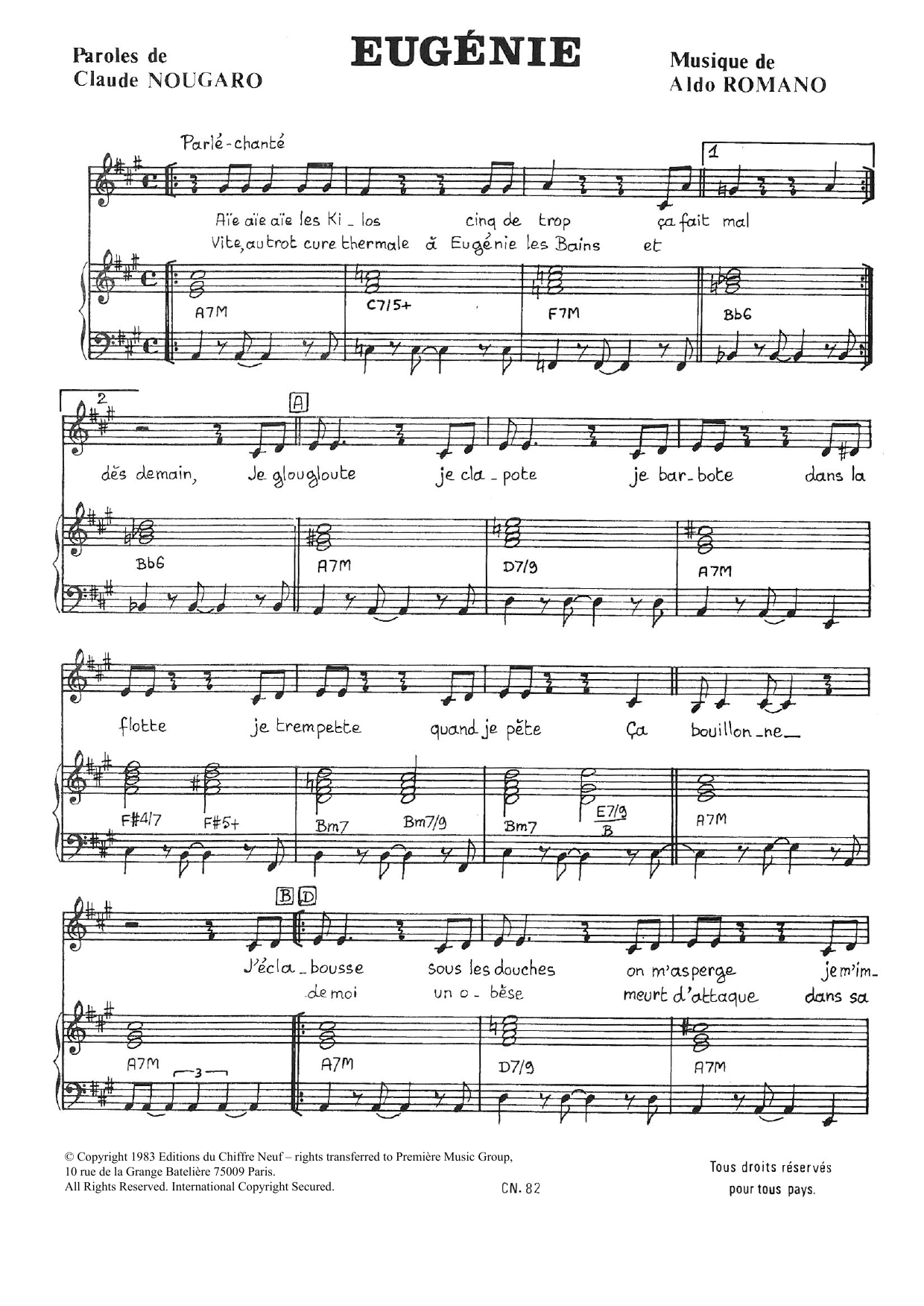 Download or print Claude Nougaro Eugenie sheet music, chords and digital score arranged for Piano & Vocal. This Pop score includes 3 page(s).