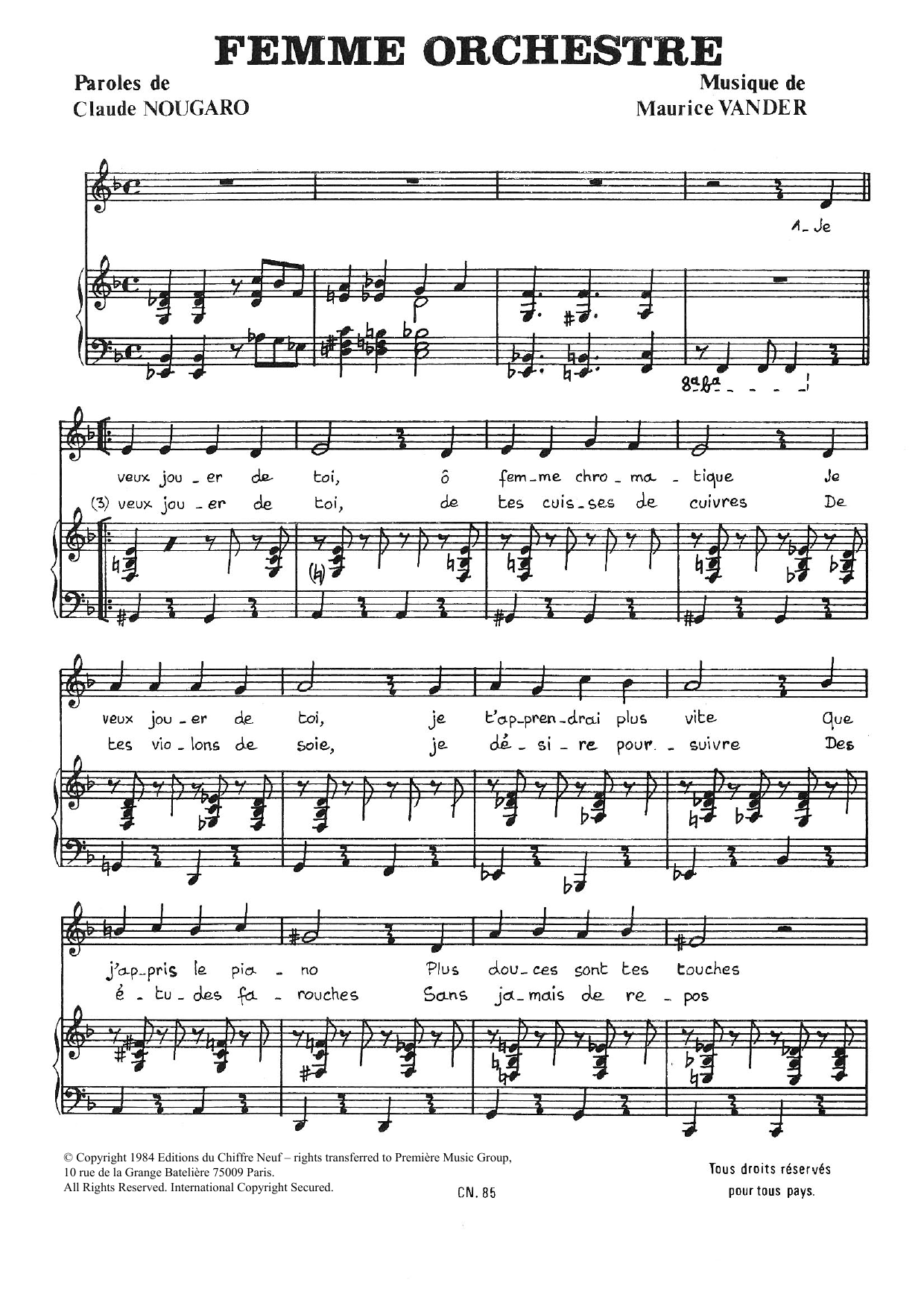 Download or print Claude Nougaro Femme Orchestre sheet music, chords and digital score arranged for Piano & Vocal. This Pop score includes 4 page(s).