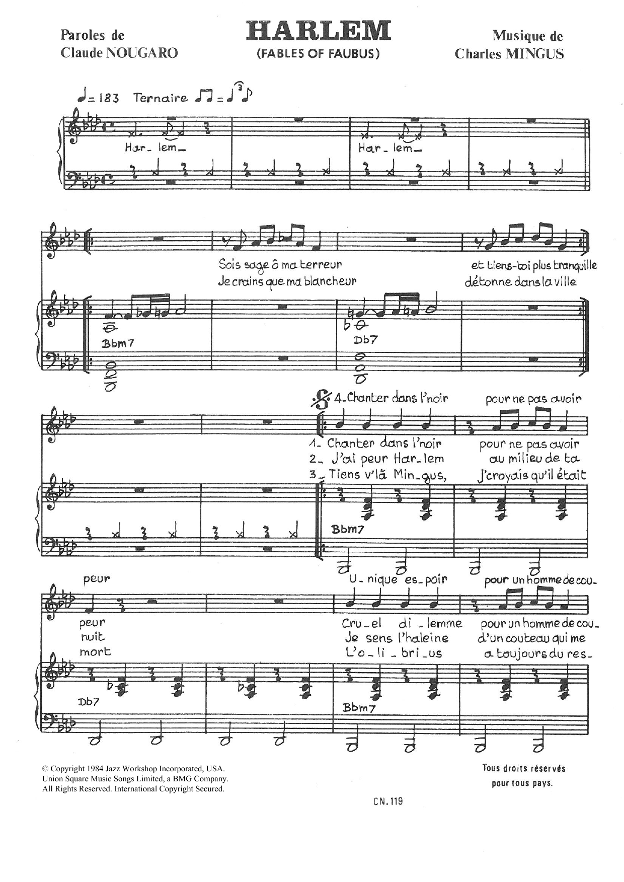 Download or print Claude Nougaro Harlem (Fables Of Faubus) sheet music, chords and digital score arranged for Piano & Vocal. This Pop score includes 4 page(s).