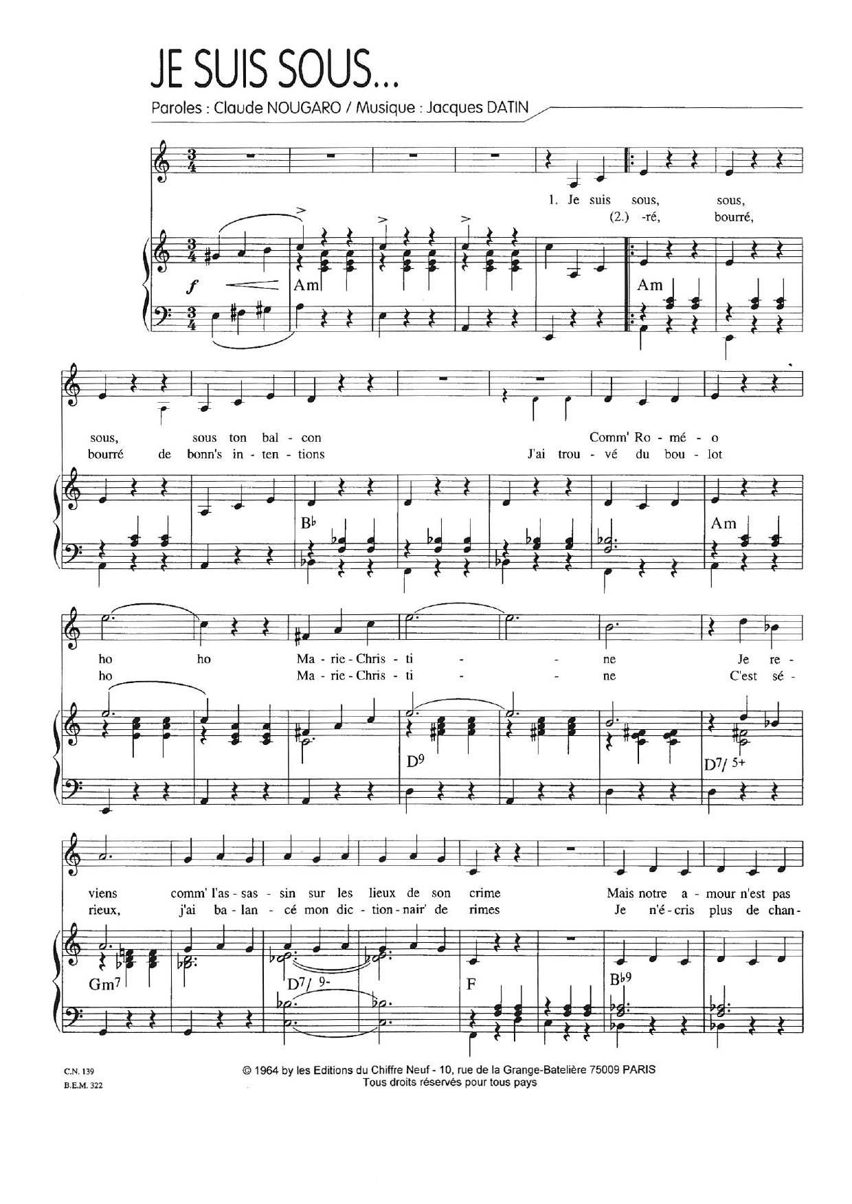 Download or print Claude Nougaro Je Suis Sous sheet music, chords and digital score arranged for Piano & Vocal. This Pop score includes 4 page(s).