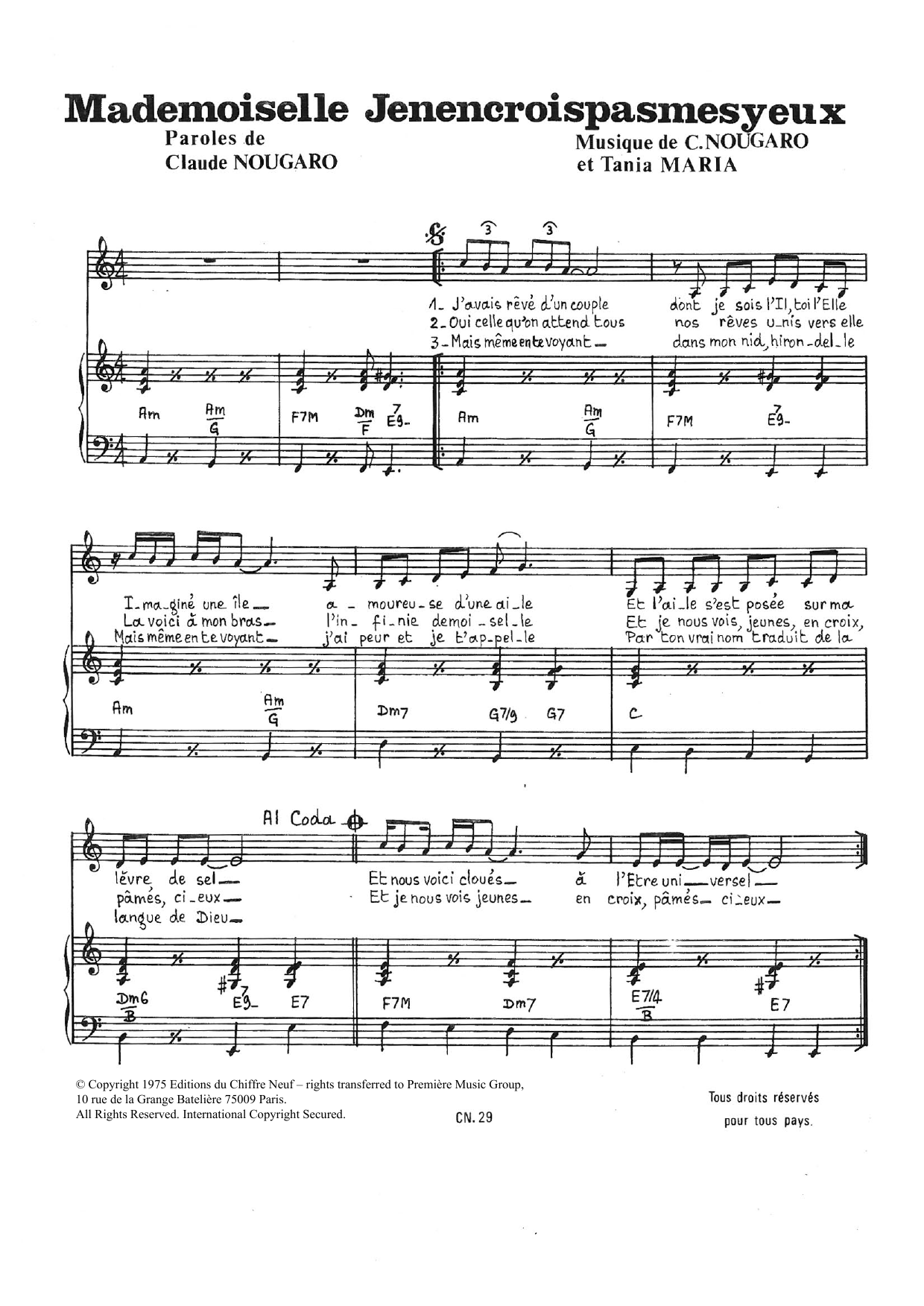 Download or print Claude Nougaro Mademoiselle Je N'en Crois Pas Mes Yeux sheet music, chords and digital score arranged for Piano & Vocal. This Pop score includes 2 page(s).