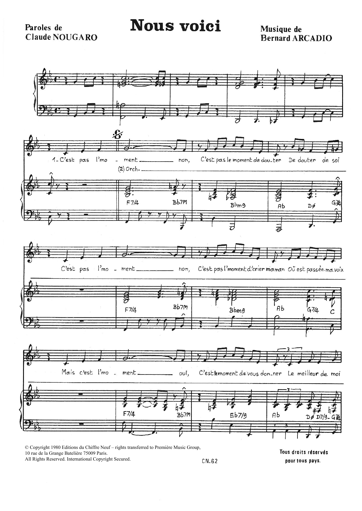 Download or print Claude Nougaro Nous Voici sheet music, chords and digital score arranged for Piano & Vocal. This Pop score includes 3 page(s).