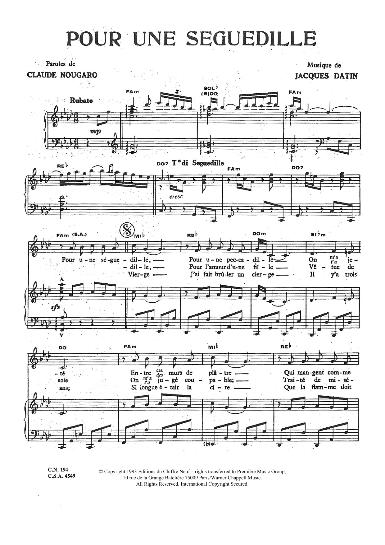 Download or print Claude Nougaro Pour Une Seguedille sheet music, chords and digital score arranged for Piano & Vocal. This Pop score includes 2 page(s).