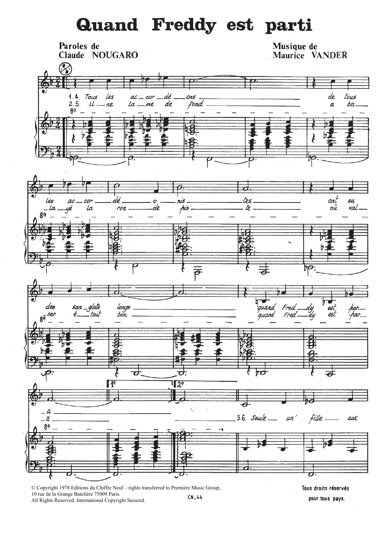 Download or print Claude Nougaro Quand Freddy Est Parti sheet music, chords and digital score arranged for Piano & Vocal. This Pop score includes 7 page(s).