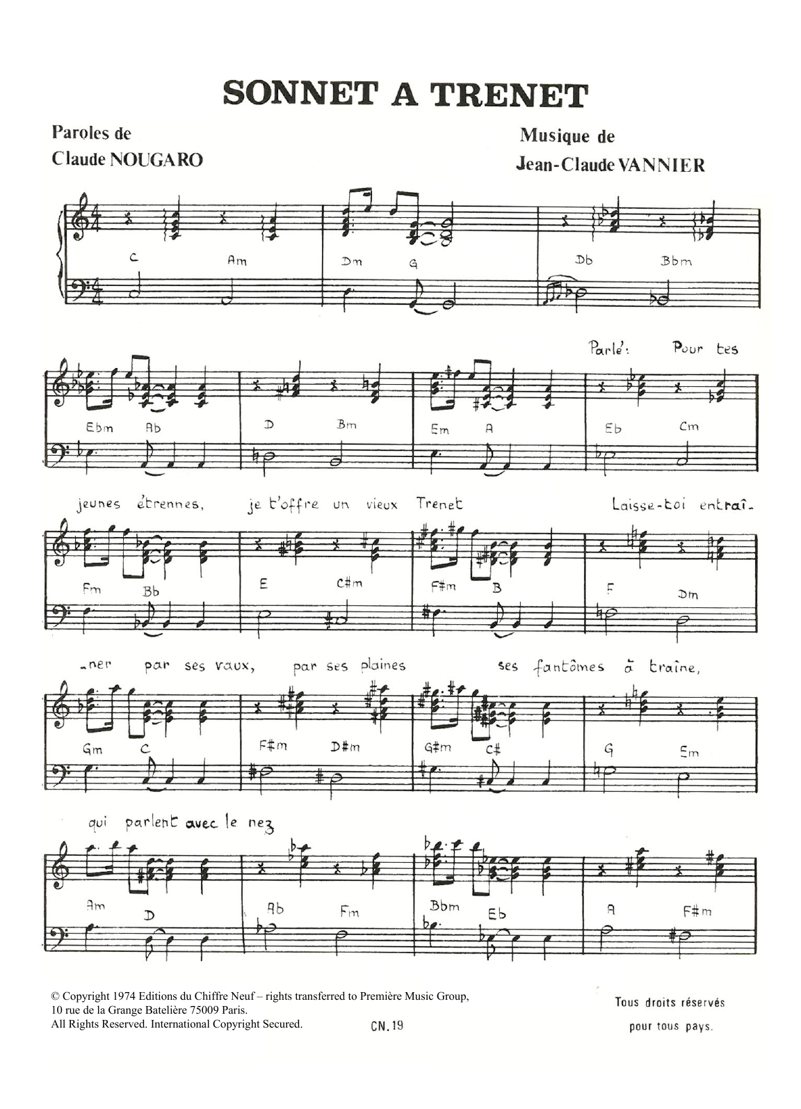 Download or print Claude Nougaro Sonnet A Trenet sheet music, chords and digital score arranged for Piano & Vocal. This Pop score includes 2 page(s).