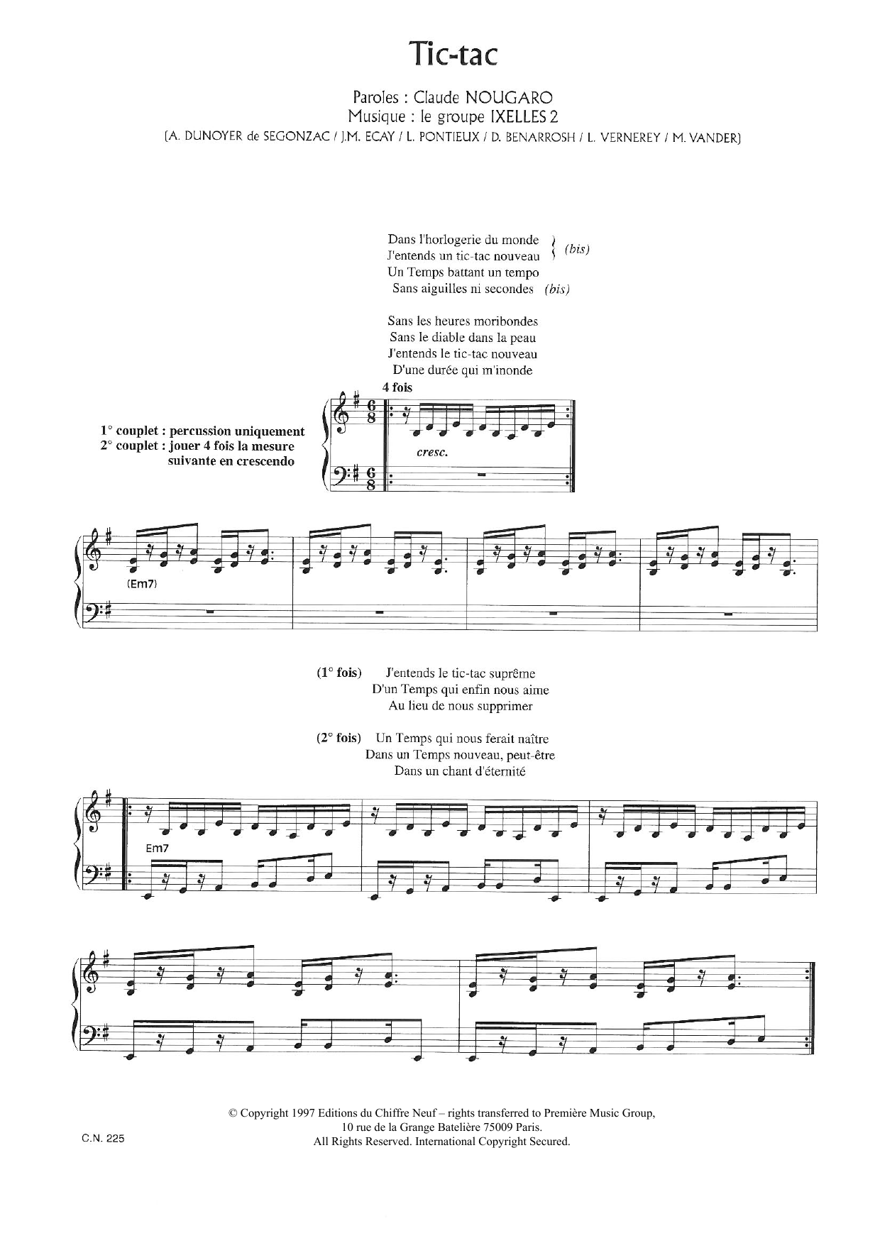 Download or print Claude Nougaro Tic Tac sheet music, chords and digital score arranged for Piano & Vocal. This Pop score includes 2 page(s).