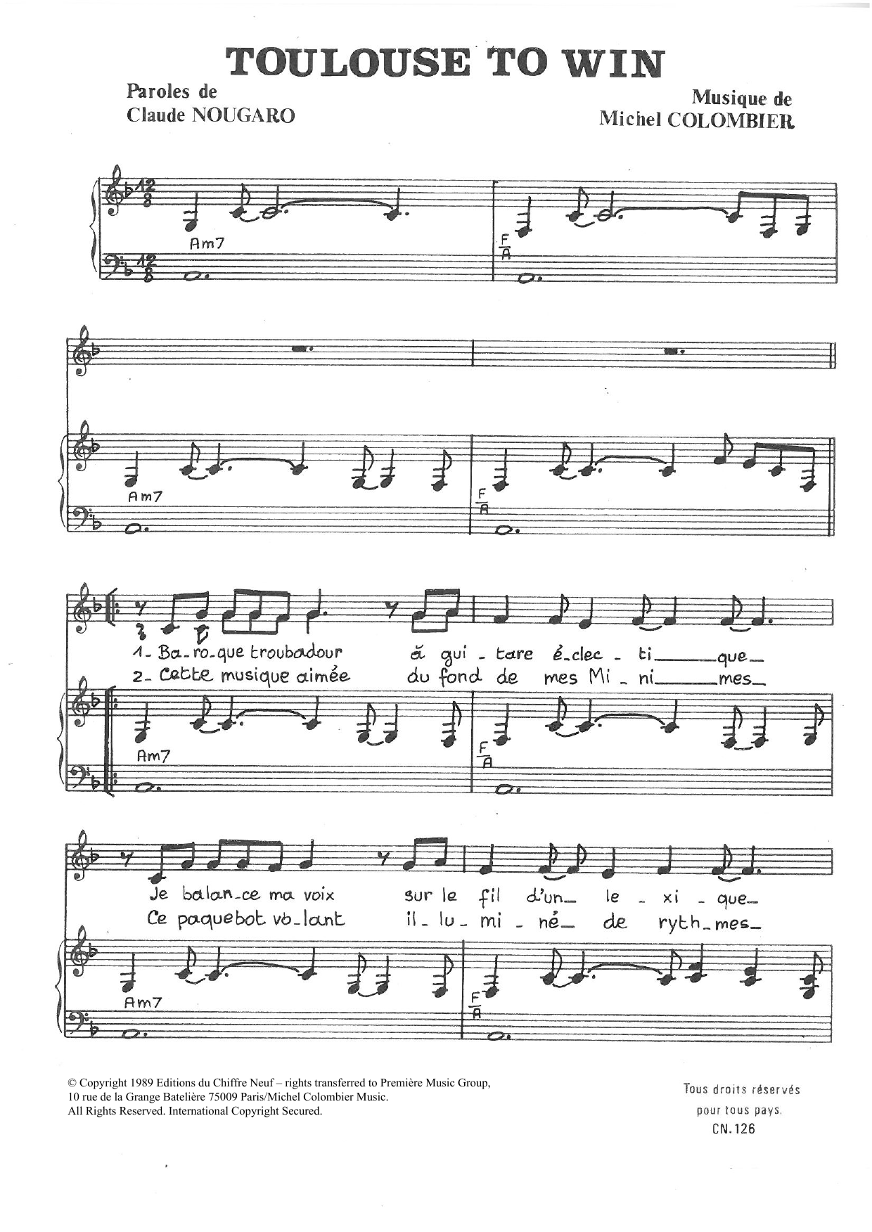 Download or print Claude Nougaro Toulouse To Win sheet music, chords and digital score arranged for Piano & Vocal. This Pop score includes 7 page(s).
