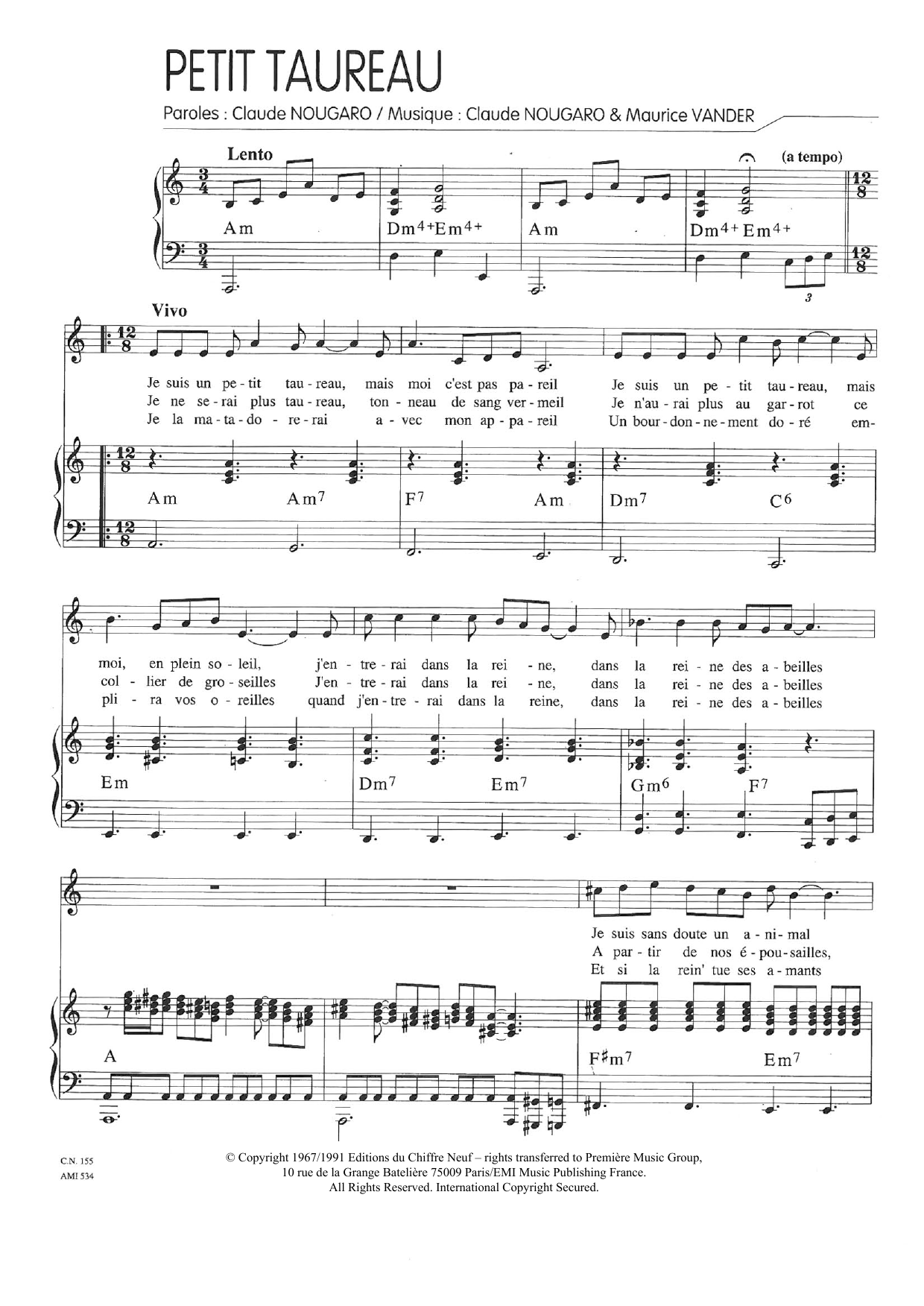 Download or print Claude Nougaro Un Petit Taureau sheet music, chords and digital score arranged for Piano & Vocal. This Pop score includes 2 page(s).