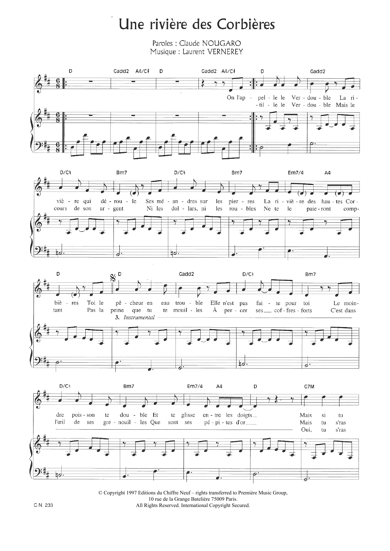 Download or print Claude Nougaro Une Riviere Des Corbieres sheet music, chords and digital score arranged for Piano & Vocal. This Pop score includes 5 page(s).