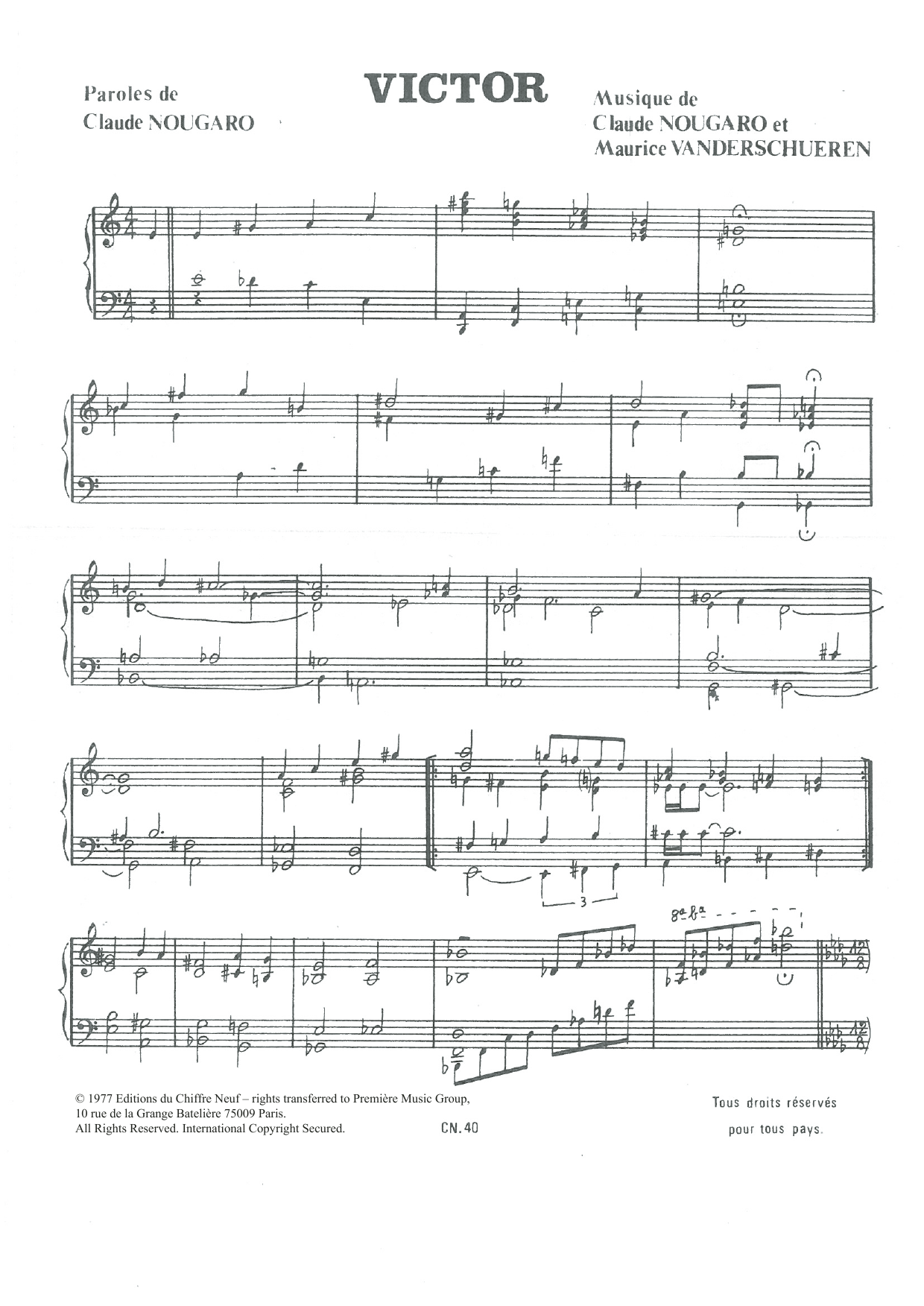 Download or print Claude Nougaro Victor sheet music, chords and digital score arranged for Piano & Vocal. This Pop score includes 24 page(s).