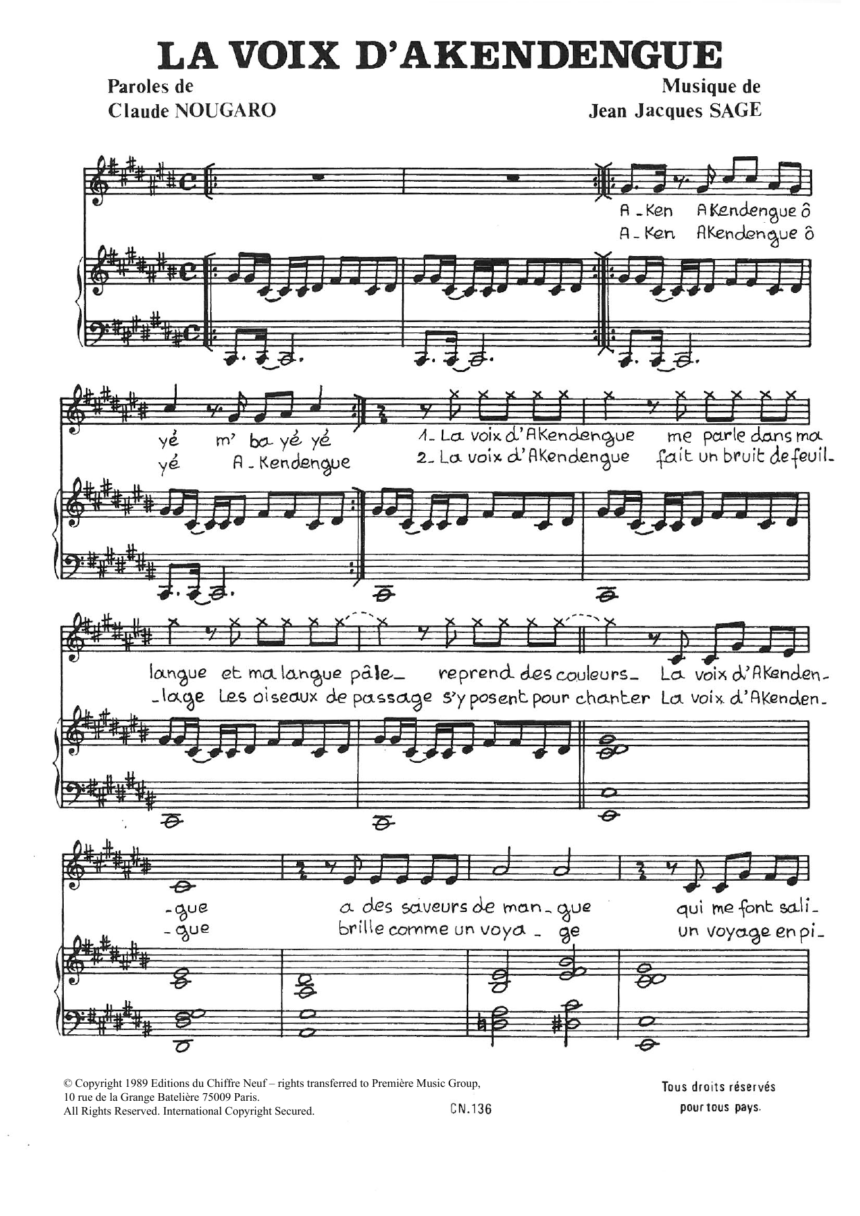 Download or print Claude Nougaro Voix D'akendengue sheet music, chords and digital score arranged for Piano & Vocal. This Pop score includes 3 page(s).