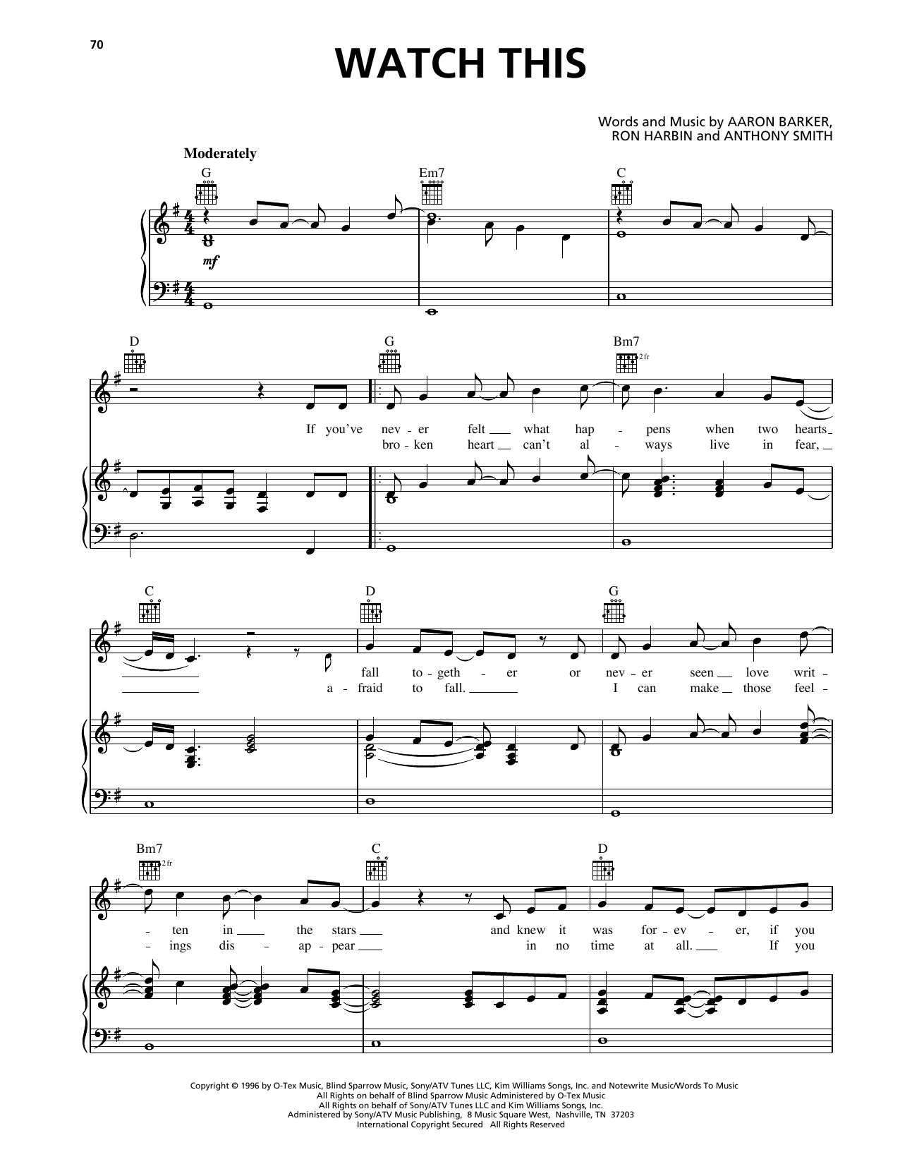 Download or print Clay Walker Watch This sheet music, chords and digital score arranged for Piano, Vocal & Guitar Chords (Right-Hand Melody). This Country score includes 5 page(s).