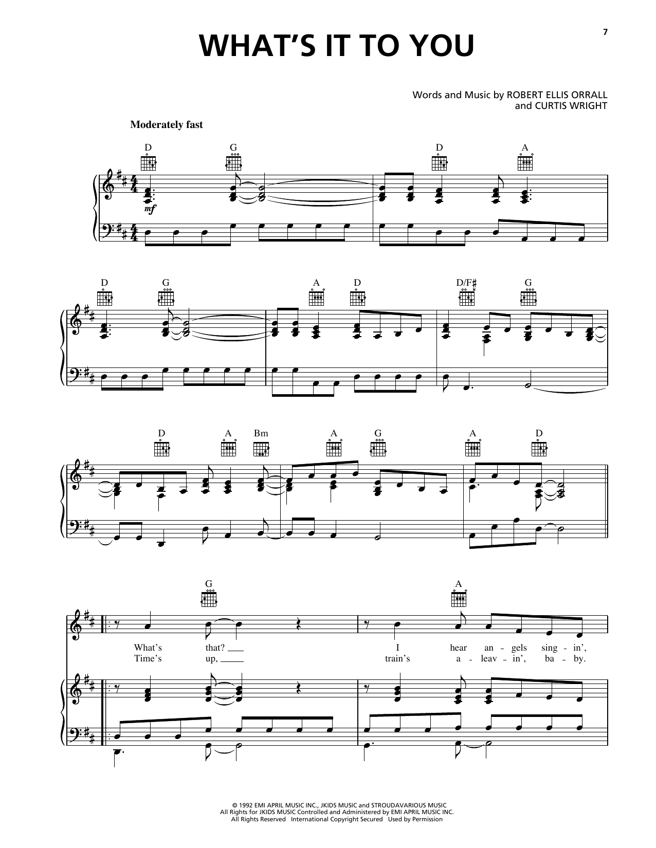 Download or print Clay Walker What's It To You sheet music, chords and digital score arranged for Piano, Vocal & Guitar Chords (Right-Hand Melody). This Country score includes 6 page(s).