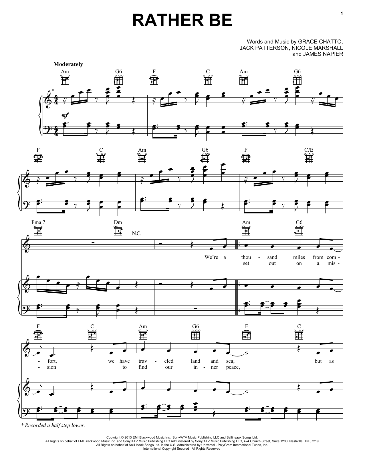 Download or print Clean Bandit feat. Jess Glynne Rather Be sheet music, chords and digital score arranged for Piano, Vocal & Guitar Chords (Right-Hand Melody). This Pop score includes 6 page(s).