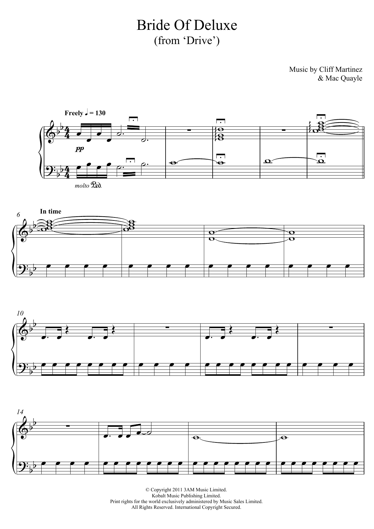 Download or print Cliff Martinez Bride Of Deluxe (from 'Drive') sheet music, chords and digital score arranged for Piano Solo. This Film/TV score includes 4 page(s).