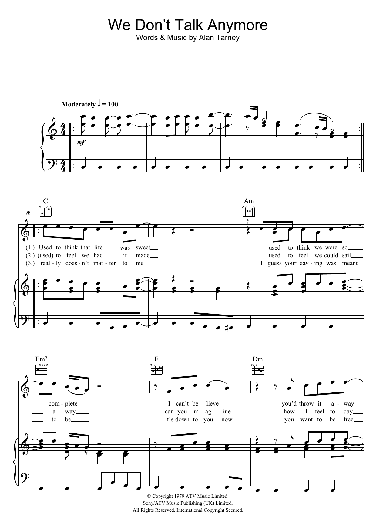 Download or print Cliff Richard We Don't Talk Anymore sheet music, chords and digital score arranged for Piano, Vocal & Guitar Chords. This Pop score includes 4 page(s).