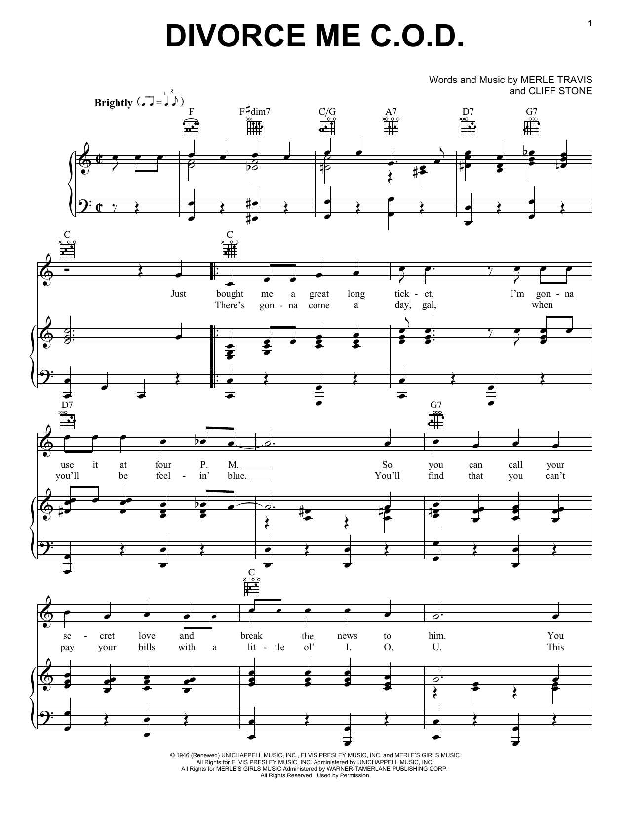 Download or print Cliff Stone Divorce Me C.O.D. sheet music, chords and digital score arranged for Piano, Vocal & Guitar Chords (Right-Hand Melody). This Country score includes 3 page(s).