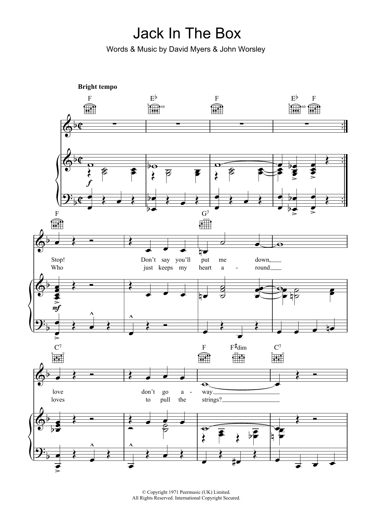 Download or print Clodagh Rodgers Jack In The Box sheet music, chords and digital score arranged for Piano, Vocal & Guitar Chords. This Standards score includes 6 page(s).