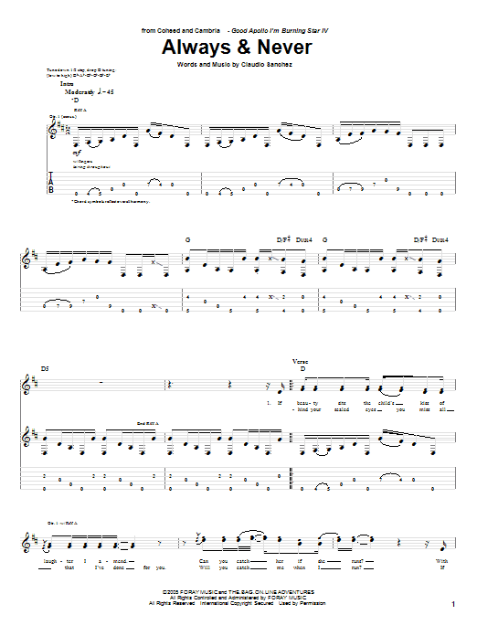 Download or print Coheed And Cambria Always & Never sheet music, chords and digital score arranged for Guitar Tab. This Pop score includes 3 page(s).