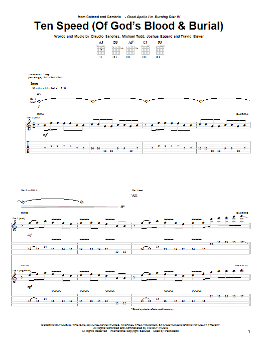 Download or print Coheed And Cambria Ten Speed (Of God's Blood & Burial) sheet music, chords and digital score arranged for Guitar Tab. This Pop score includes 12 page(s).