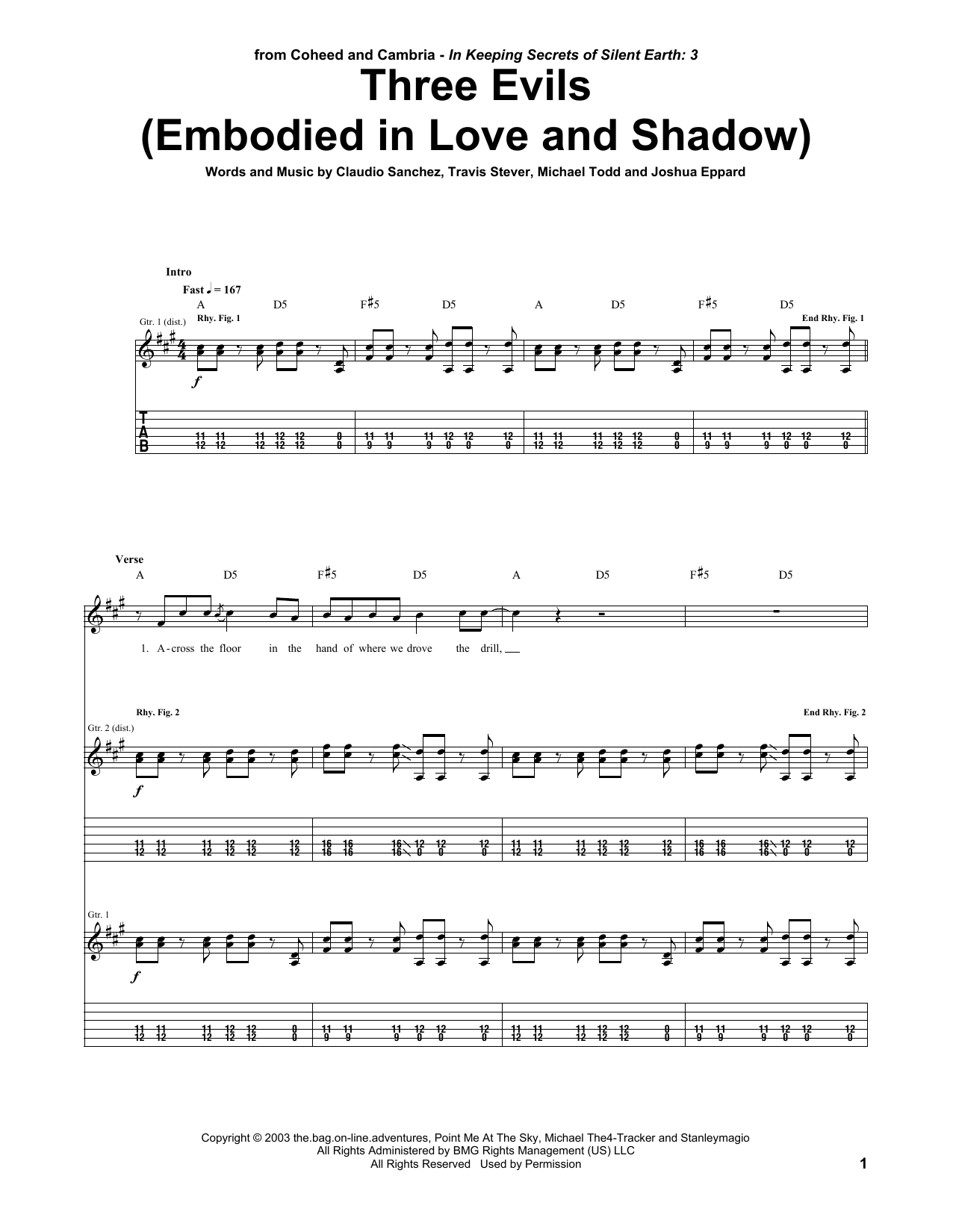 Download or print Coheed And Cambria Three Evils (Embodied In Love And Shadow) sheet music, chords and digital score arranged for Guitar Tab. This Metal score includes 12 page(s).