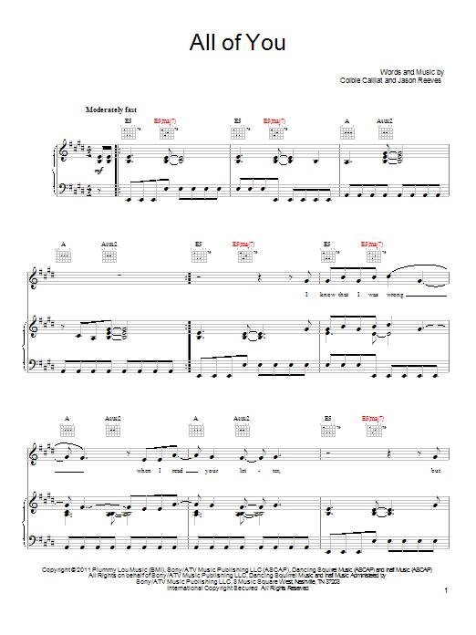 Download or print Colbie Caillat All Of You sheet music, chords and digital score arranged for Piano, Vocal & Guitar Chords (Right-Hand Melody). This Pop score includes 7 page(s).