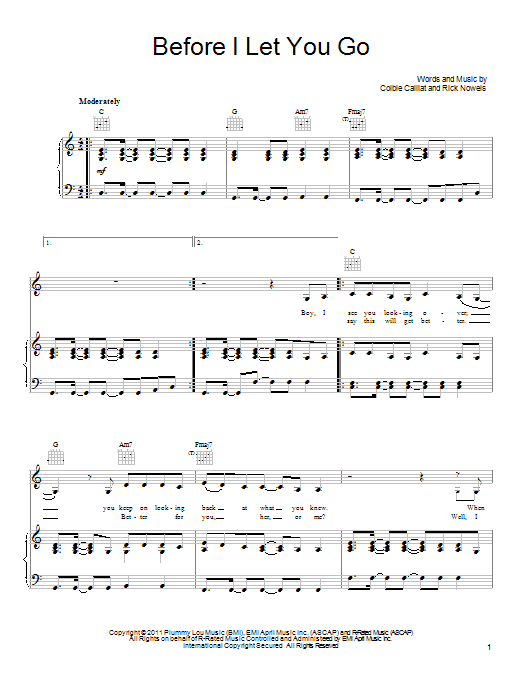 Download or print Colbie Caillat Before I Let You Go sheet music, chords and digital score arranged for Piano, Vocal & Guitar Chords (Right-Hand Melody). This Pop score includes 6 page(s).