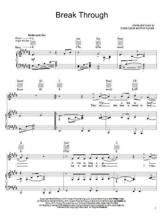 Download or print Colbie Caillat Break Through sheet music, chords and digital score arranged for Piano, Vocal & Guitar Chords (Right-Hand Melody). This Pop score includes 5 page(s).