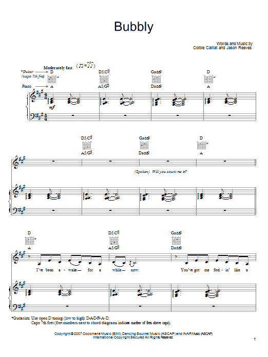 Download or print Colbie Caillat Bubbly sheet music, chords and digital score arranged for Piano, Vocal & Guitar Chords (Right-Hand Melody). This Love score includes 7 page(s).