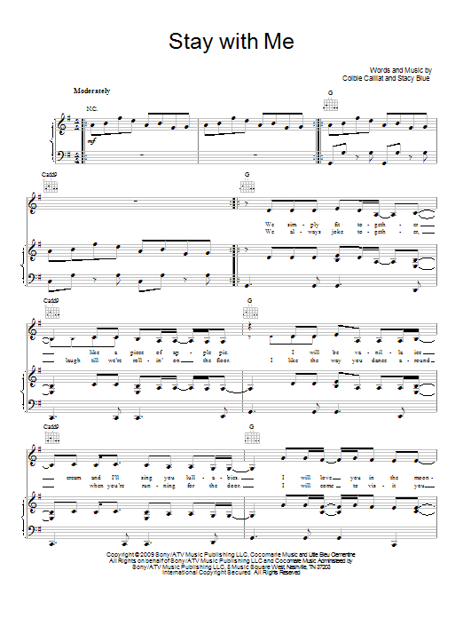 Download or print Colbie Caillat Stay With Me sheet music, chords and digital score arranged for Piano, Vocal & Guitar Chords (Right-Hand Melody). This Pop score includes 5 page(s).
