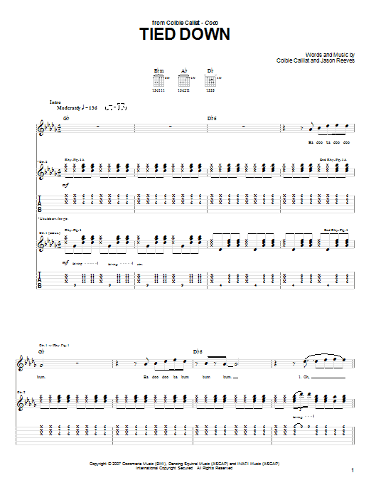 Download or print Colbie Caillat Tied Down sheet music, chords and digital score arranged for Guitar Tab. This Pop score includes 5 page(s).
