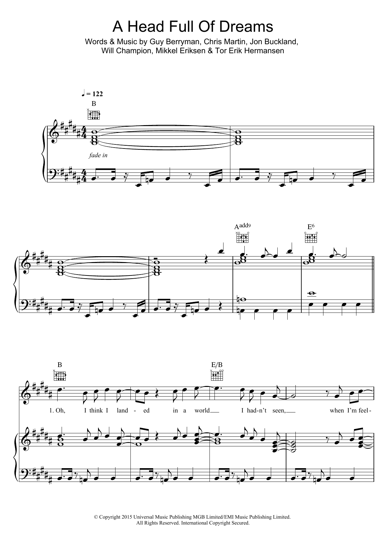 Download or print Coldplay A Head Full Of Dreams sheet music, chords and digital score arranged for Piano, Vocal & Guitar Chords (Right-Hand Melody). This Pop score includes 7 page(s).