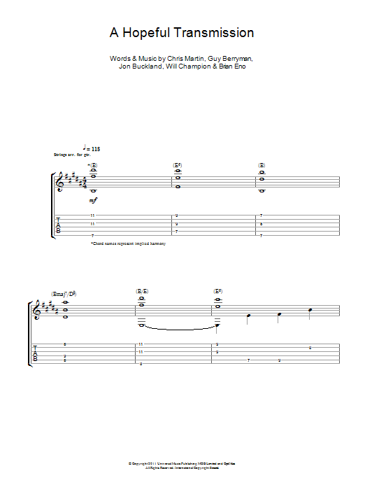 Download or print Coldplay A Hopeful Transmission sheet music, chords and digital score arranged for Guitar Tab. This Pop score includes 2 page(s).