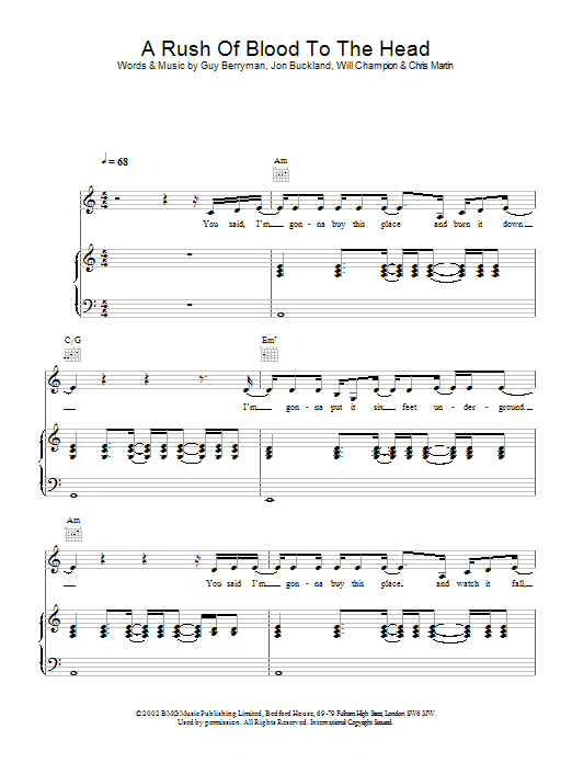Download or print Coldplay A Rush Of Blood To The Head sheet music, chords and digital score arranged for Easy Piano. This Pop score includes 7 page(s).