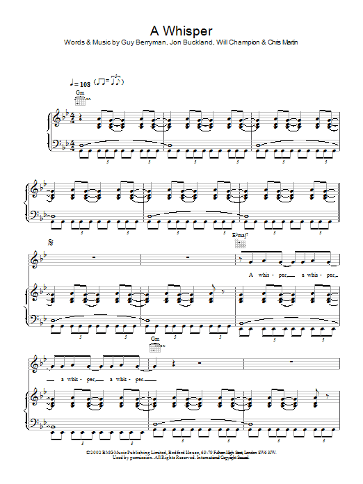 Download or print Coldplay A Whisper sheet music, chords and digital score arranged for Guitar Tab. This Pop score includes 10 page(s).