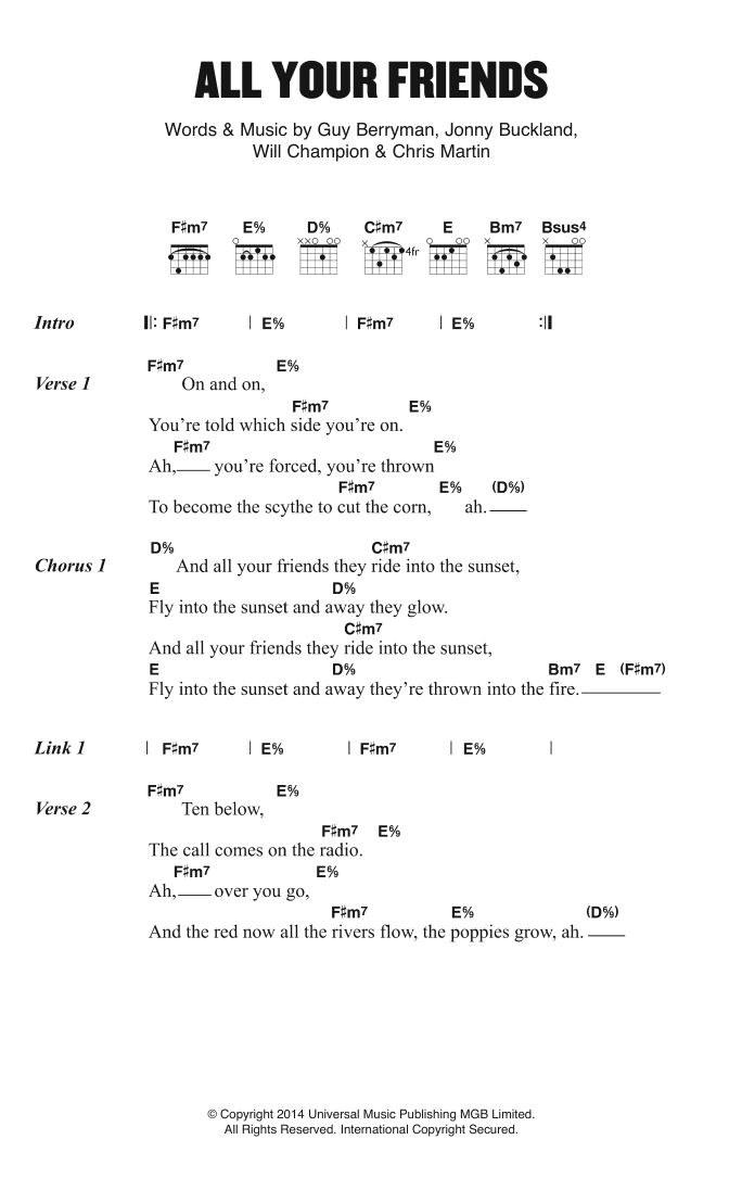 Download or print Coldplay All Your Friends sheet music, chords and digital score arranged for Guitar Chords/Lyrics. This Pop score includes 2 page(s).