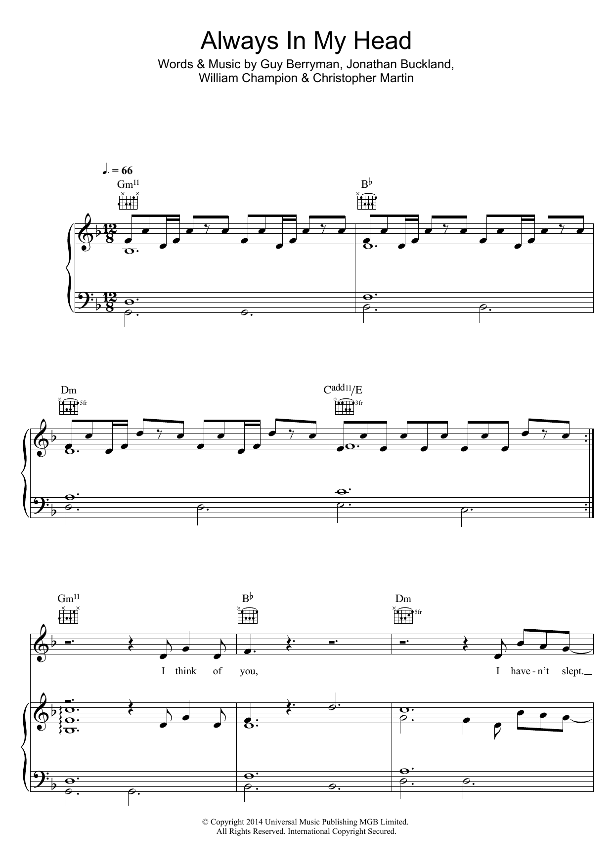 Download or print Coldplay Always In My Head sheet music, chords and digital score arranged for Guitar Chords/Lyrics. This Rock score includes 2 page(s).