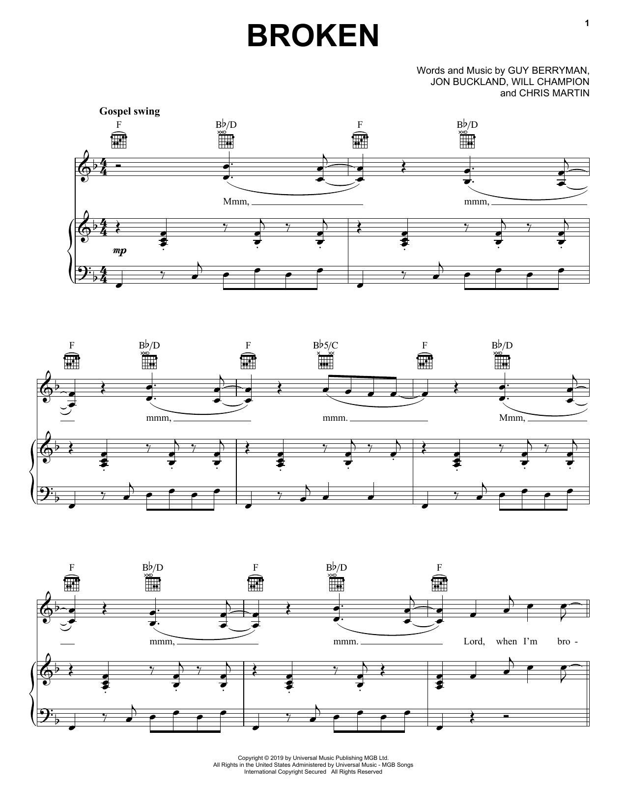 Download or print Coldplay Broken sheet music, chords and digital score arranged for Piano, Vocal & Guitar Chords (Right-Hand Melody). This Pop score includes 5 page(s).