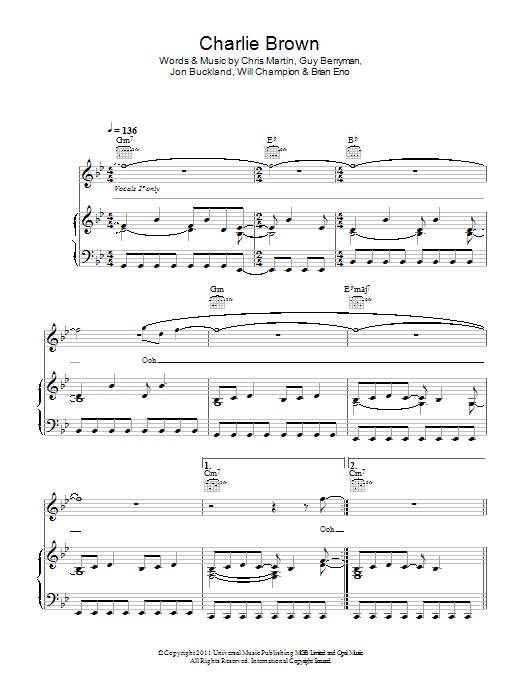 Download or print Coldplay Charlie Brown sheet music, chords and digital score arranged for Guitar Chords/Lyrics. This Rock score includes 3 page(s).