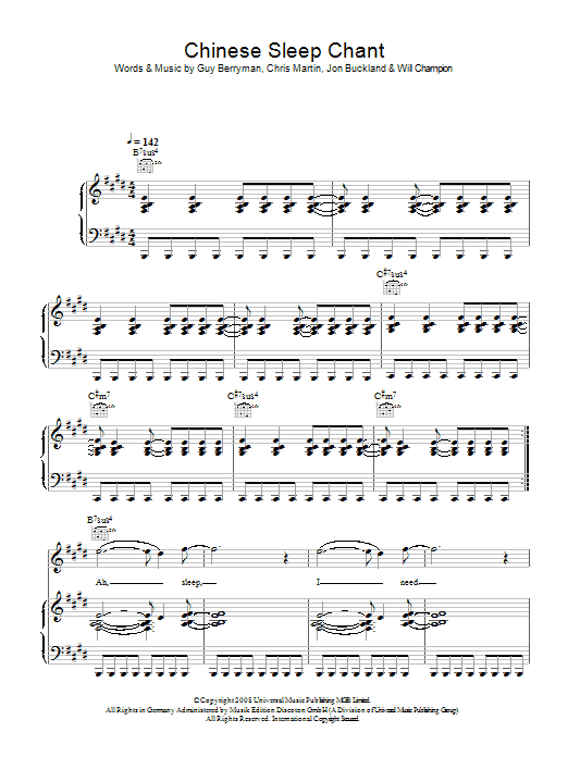 Download or print Coldplay Chinese Sleep Chant sheet music, chords and digital score arranged for Piano, Vocal & Guitar Chords. This Pop score includes 5 page(s).