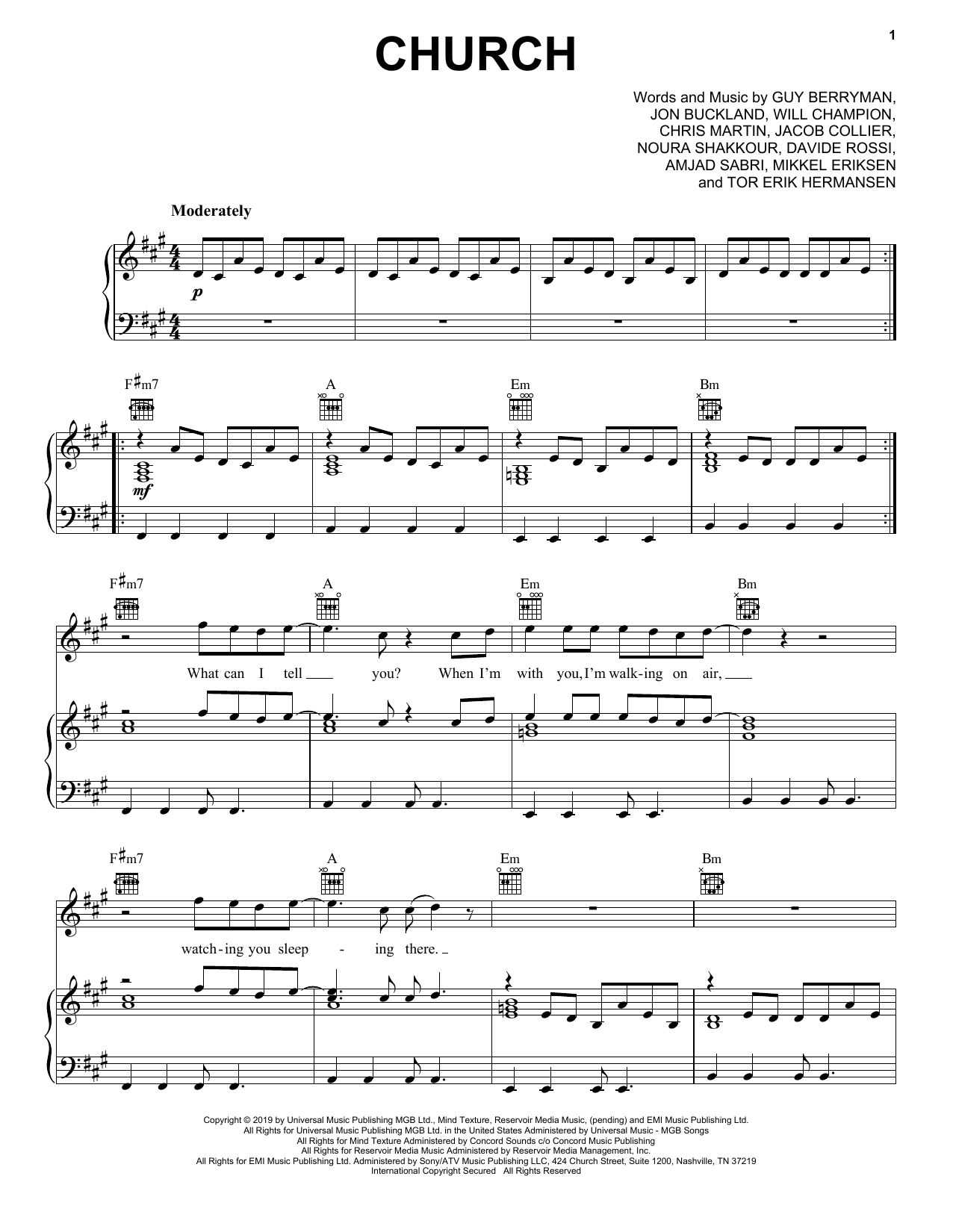 Download or print Coldplay Church sheet music, chords and digital score arranged for Piano, Vocal & Guitar Chords (Right-Hand Melody). This Pop score includes 7 page(s).