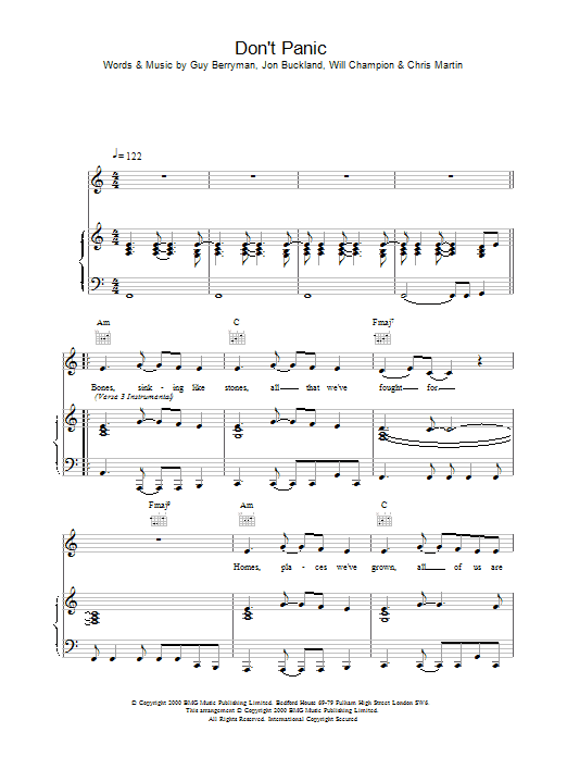 Download or print Coldplay Don't Panic sheet music, chords and digital score arranged for Drum Chart. This Rock score includes 3 page(s).