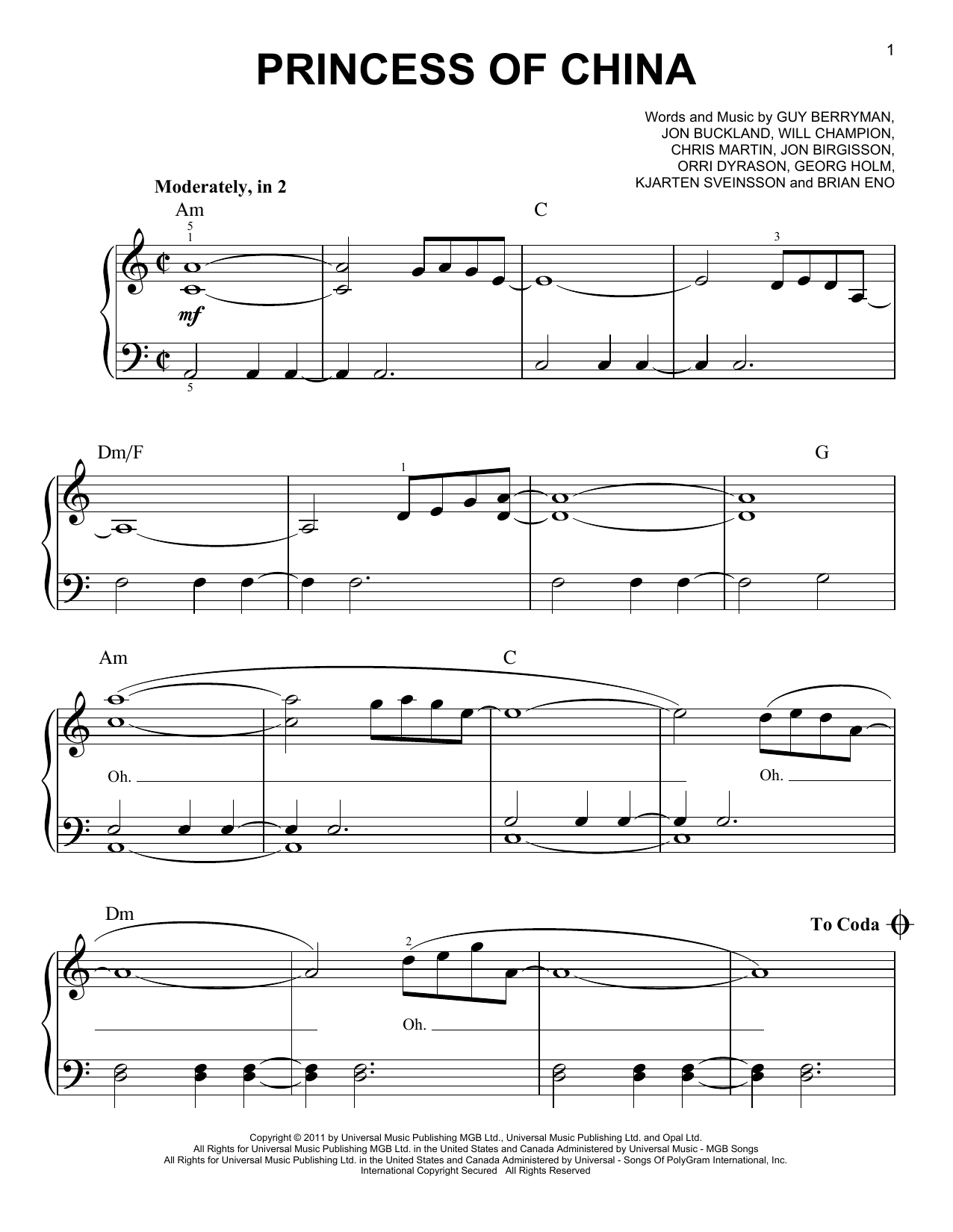 Download or print Coldplay featuring Rihanna Princess Of China sheet music, chords and digital score arranged for Guitar Chords/Lyrics. This Pop score includes 2 page(s).