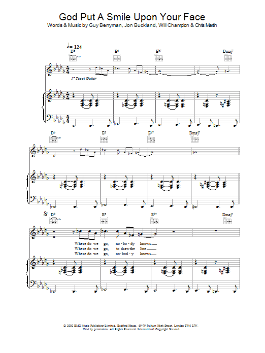 Download or print Coldplay God Put A Smile Upon Your Face sheet music, chords and digital score arranged for Guitar Chords/Lyrics. This Pop score includes 2 page(s).