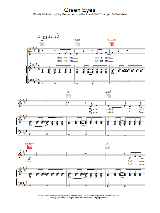 Download or print Coldplay Green Eyes sheet music, chords and digital score arranged for Easy Piano. This Pop score includes 5 page(s).