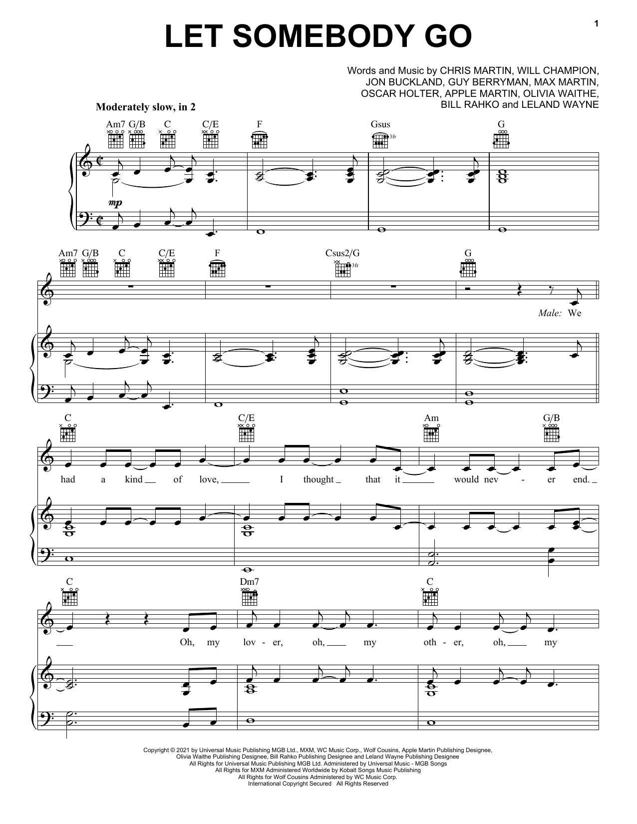 Download or print Coldplay Let Somebody Go (feat. Selena Gomez) sheet music, chords and digital score arranged for Piano, Vocal & Guitar Chords (Right-Hand Melody). This Pop score includes 9 page(s).