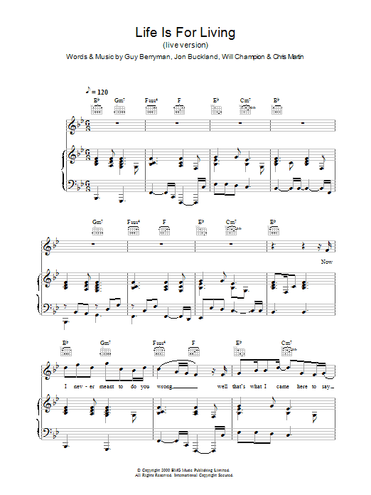 Download or print Coldplay Life Is For Living (live version) sheet music, chords and digital score arranged for Piano, Vocal & Guitar Chords. This Pop score includes 5 page(s).