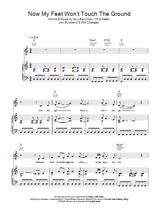 Download or print Coldplay Now My Feet Won't Touch The Ground sheet music, chords and digital score arranged for Piano, Vocal & Guitar Chords. This Pop score includes 4 page(s).